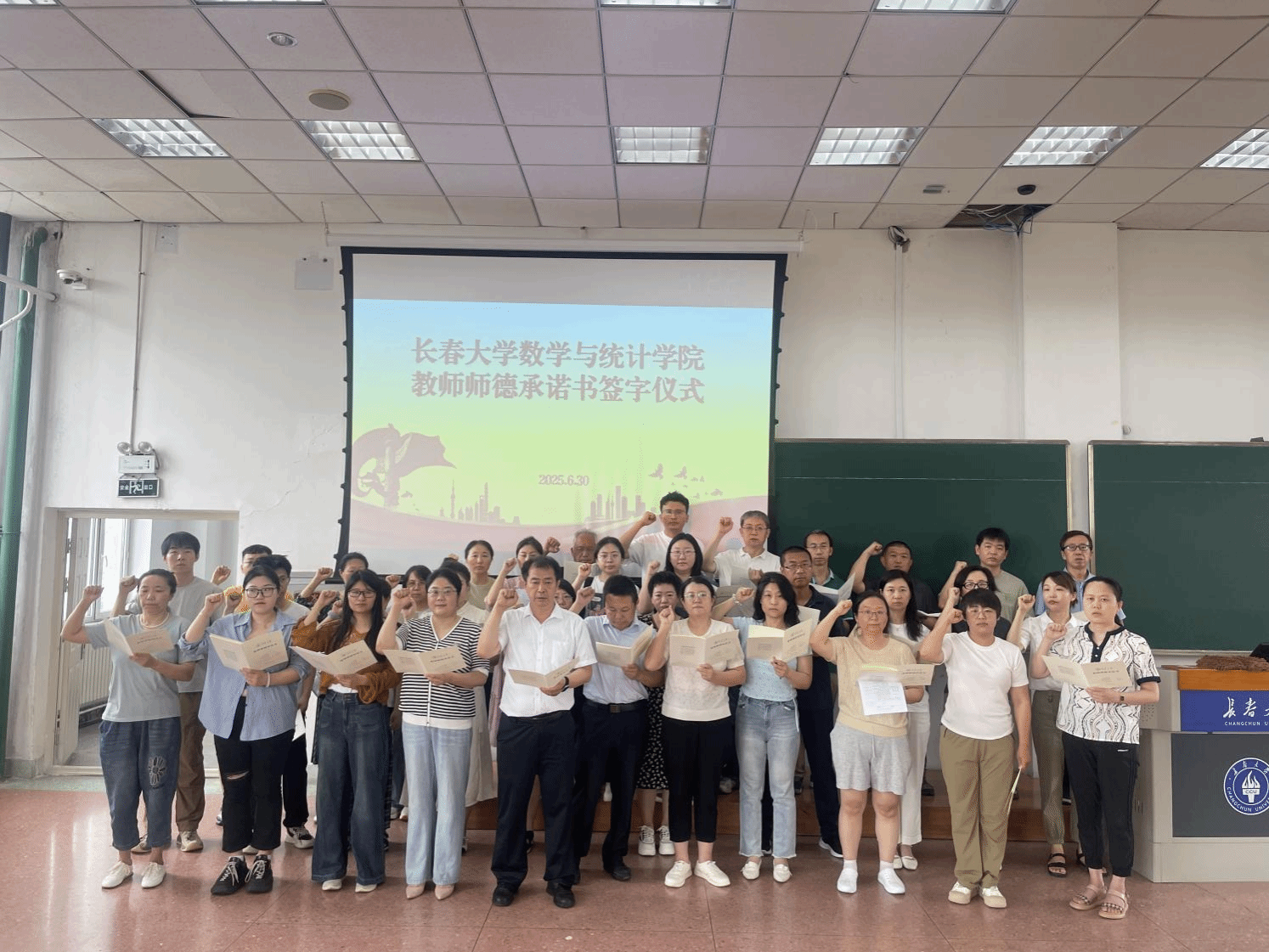 6月30日,学院在第六教学楼西十阶梯教室气氛庄重而热烈,师德师风宣誓仪式在这里隆重举行。学院党委书记李险峰出席并领读《师德师风承诺书》,全体教师整齐列队,高举右拳,共同许下“为党育人、为国育才”的庄严承诺。